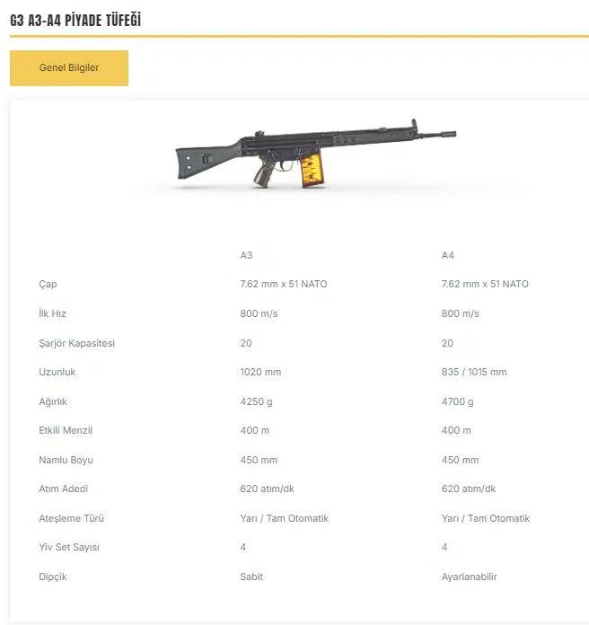 G3 Piyade tüfeğinin Namlu uzunluğu 45 cm dir